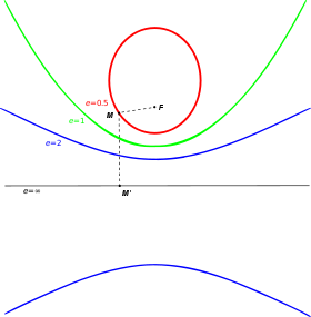 Трета дефиниция (една от най - често срещаната в учебните помагала по аналитична геометрия) е следната: геометрично място на точки в равнината, които притежават свойството: отношението между разстоянието им до дадена точка в същата равнина, наречена фокус, и разстоянието им до дадена права в същата равнина (наречена директриса), е постоянно, наречено ексцентрицитет е. При 0 < e < 1 коничното сечние се нарича елипса, при e = 1 - парабола, при e > 1 - хипербола. Окръжността се разглежда като частен случай на елипса, като двете са затворени криви, за разлика от остналите 2 вида конични сечния: парабола и хипербола. По - долу показваме с анимиран аплет и още един чертеж общата връзка между 3 вида конични сечения с хипервръзки към световната енциклопедия.