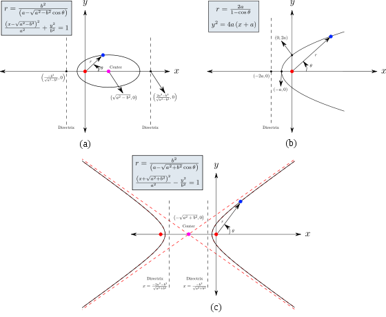 На фигурата по - долу са посочени формите на 3 вида конични сечения, заедно със свързаните с тях формули. Начертани са директрисите и са посочени местата на фокусите. От фигурата има хипервръзка към уголемения й формата световната ИНТЕРНЕТ енциклопедия.